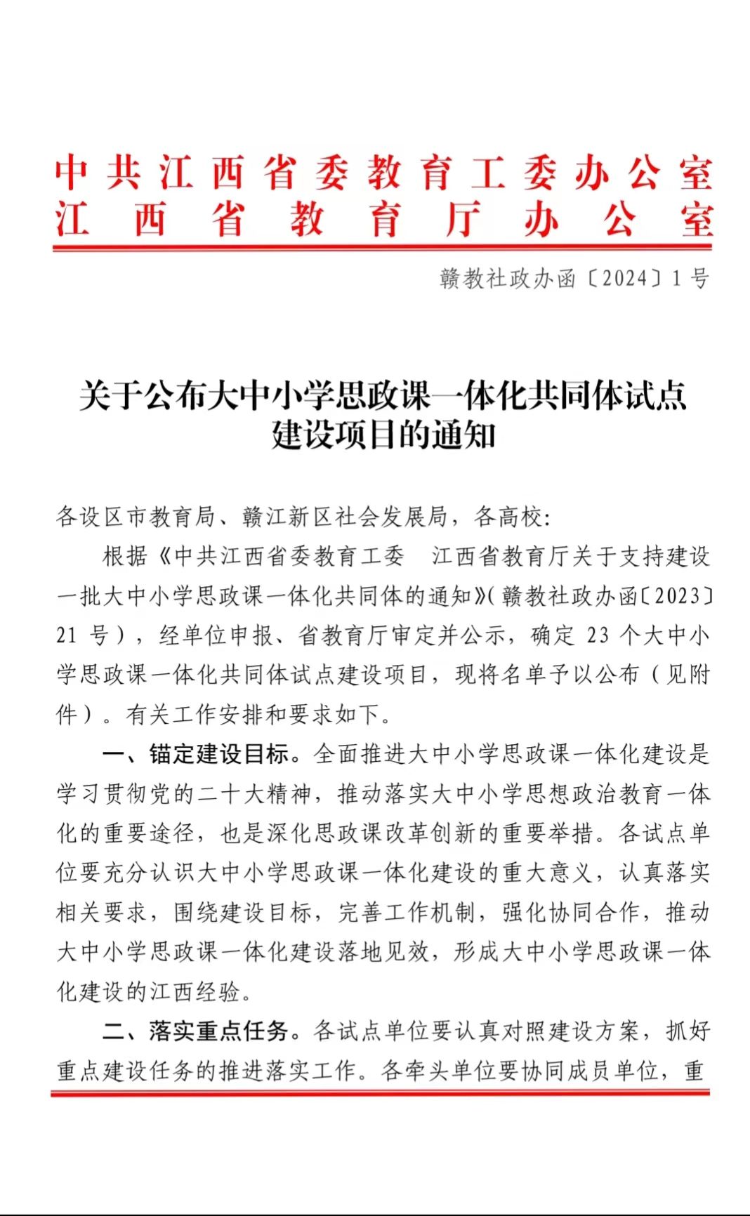 近日,中共江西省委教育工委、江西省教育厅发布了《关于公布大中小学思政课一体化共同体试点建设项目的通知》,欧博牵头组建的“大中小学思政课一体化共同体”成功入选省级建设名单。