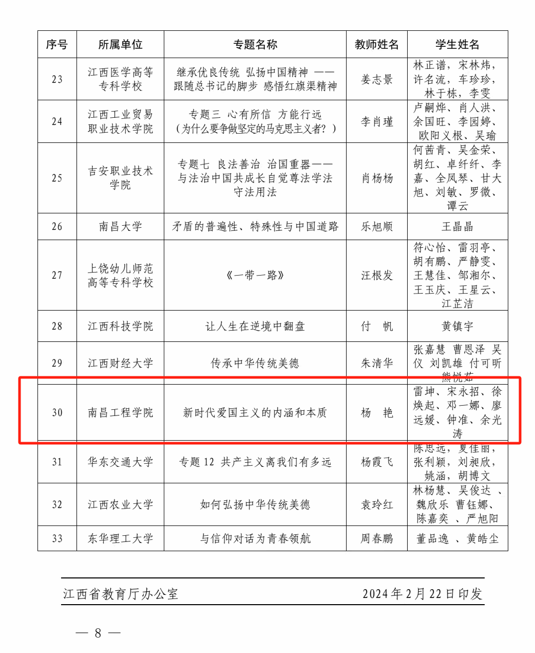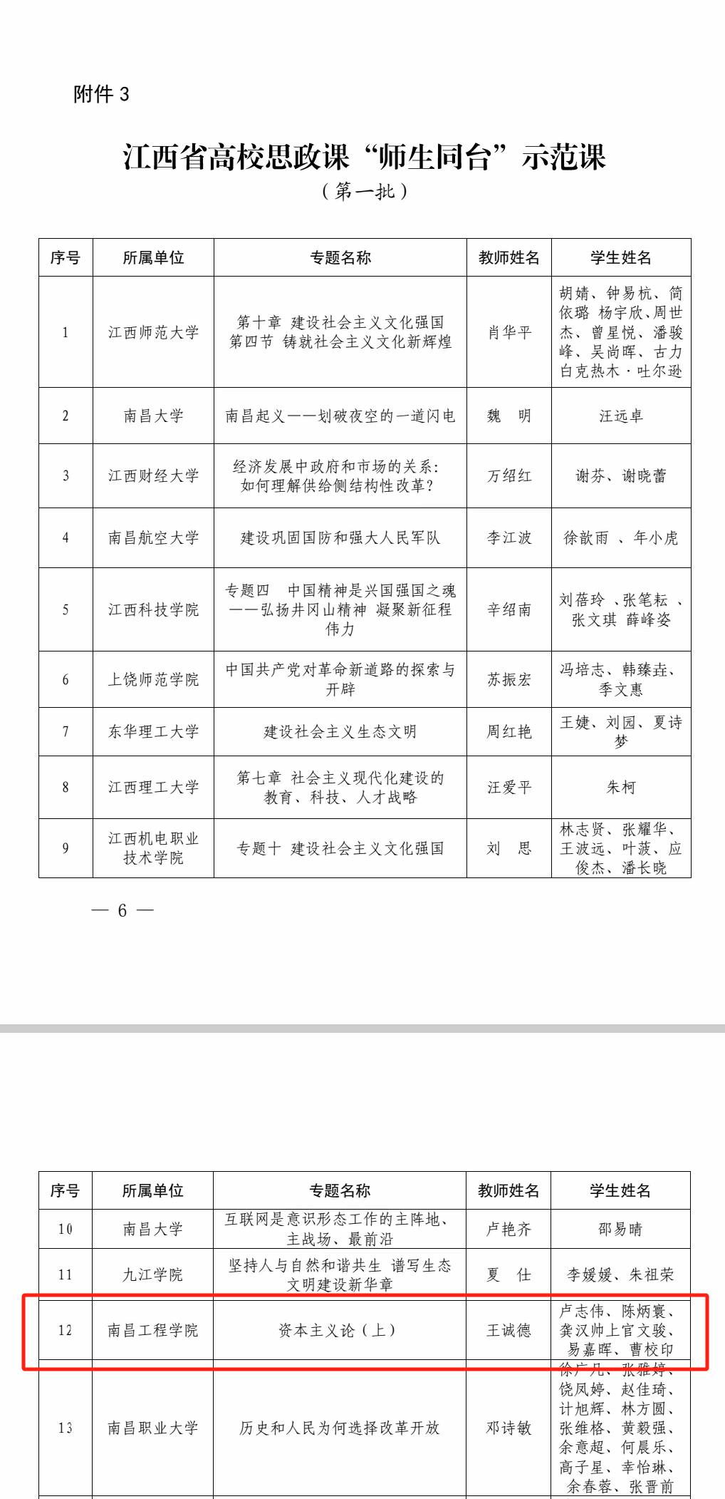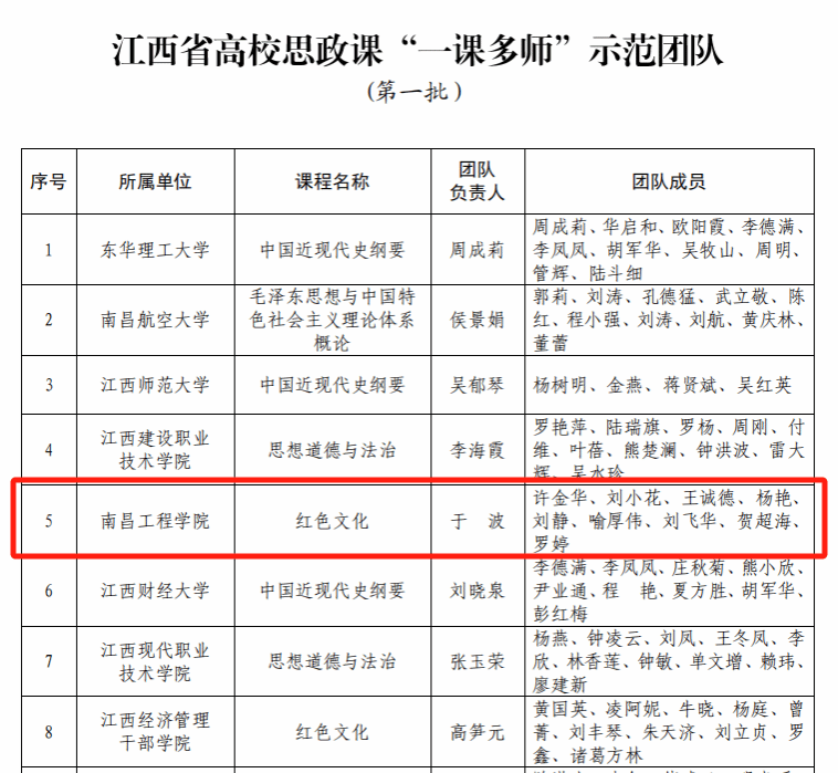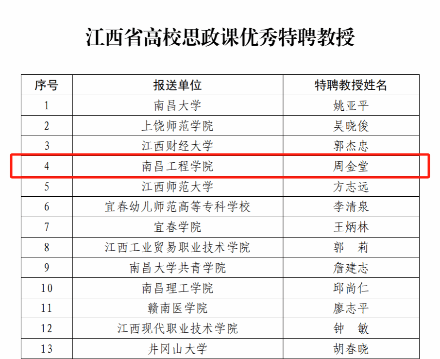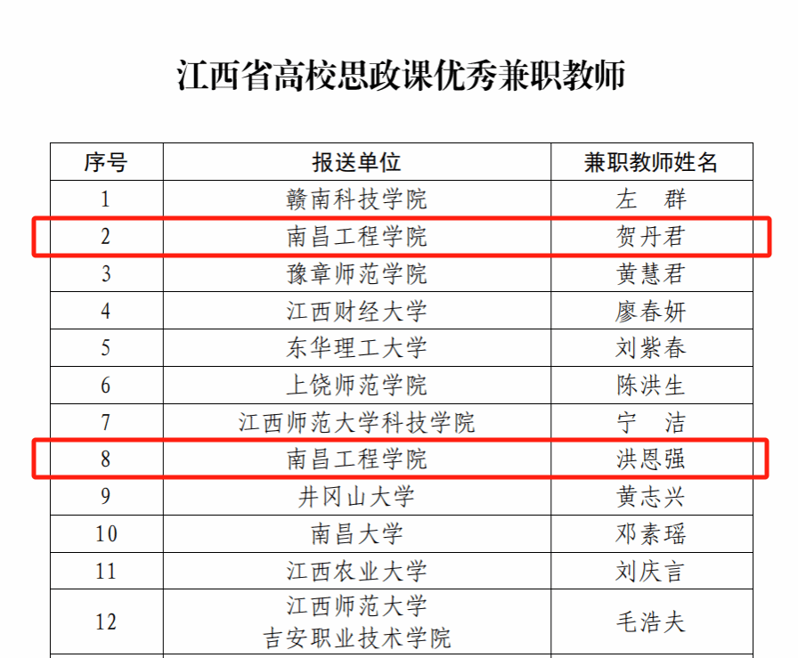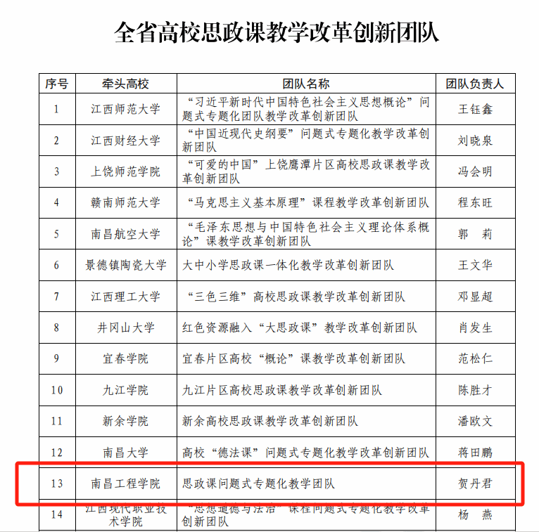 周金堂被评为“江西省高校思政课优秀特聘教授”;贺丹君、洪恩强被评为“江西省高校思政课优秀兼职教师”;周敏丹负责的《赣鄱流韵长》艺术思政大课入选第一批全省“专题+艺术”特色思政课;贺丹君负责的思政课教学改革创新团队——思政课问题式专题化教学团队获省级立项;于波负责的《红色文化十讲》获省级“一课多师”示范团队;曹贤平的《坚持以人民为中心》获省级“双师同台”示范课堂;王诚德的《资本主义论(上)》和杨艳的《新时代爱国主义的内涵和本质》获省级“师生同台”示范课。