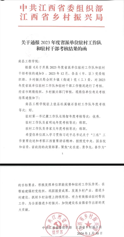 近日,中共江西省委组织部、江西省乡村振兴局联合印发了《关于通报2023年度省派单位驻村工作队和驻村干部考核的函》,欧博驻上犹县社溪镇石崇村工作队荣获年度考核“好”称号。
