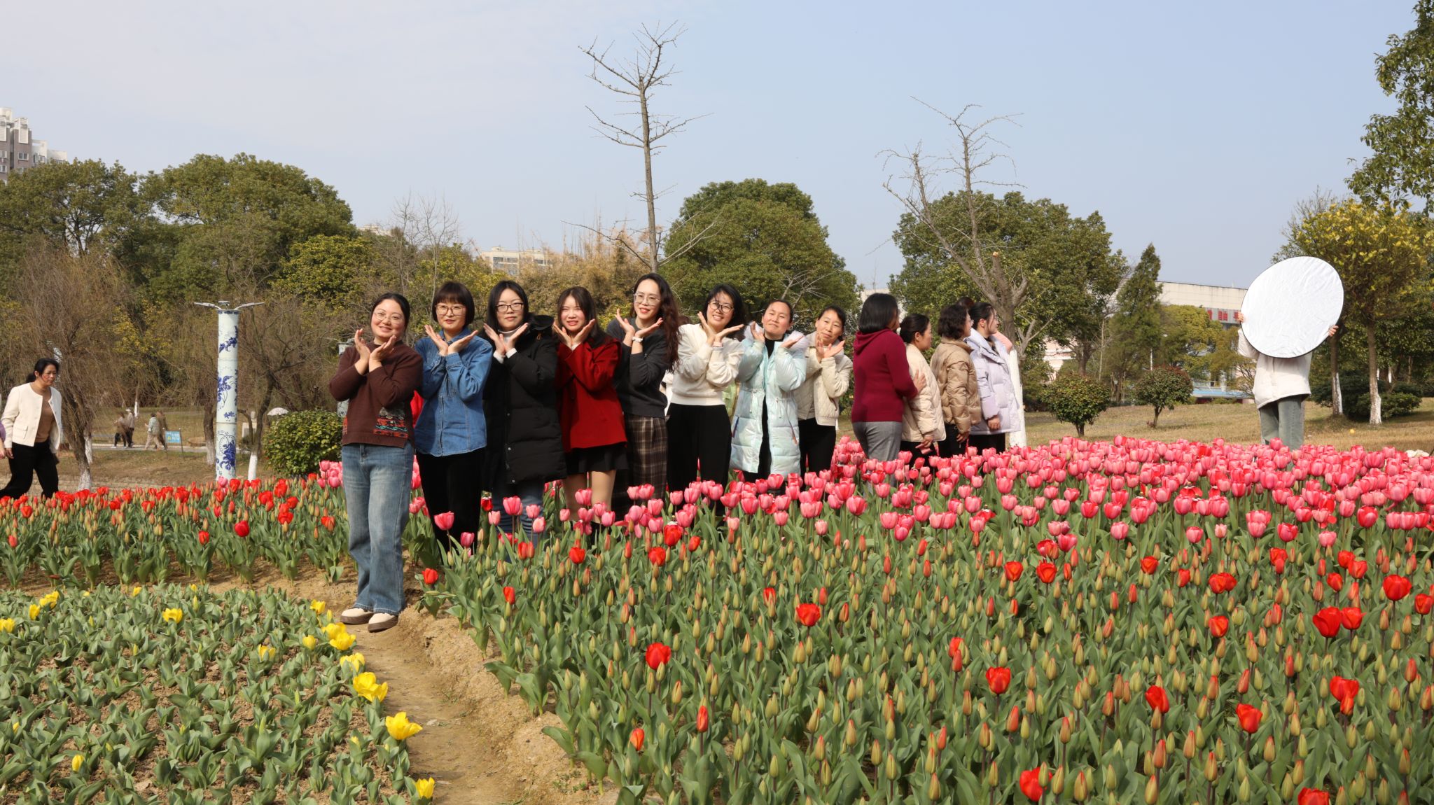 女教职工们漫步在阳光下、沐浴在春风里,欣赏着色彩丰富、婀娜多姿的郁金香、海棠花、玉兰花、迎春花等瑶湾美景,听着学生志愿者对瑶湾打卡点的介绍,一路欢声笑语。
