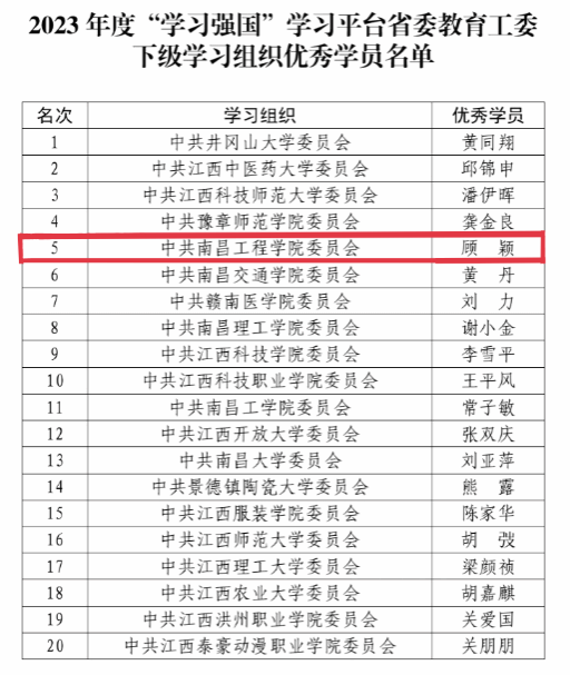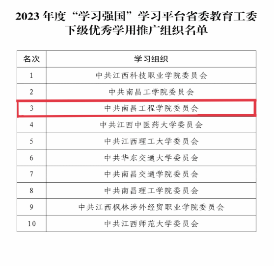 据悉,学校深入学习贯彻习近平新时代中国特色社会主义思想,始终将“学习强国”学习平台作为思想建设的重要阵地。下一步,学校将充分发挥“优秀学用推广组织”的引领作用和“优秀学员”的模范作用,持续加强“学习强国”等学习平台的推广使用工作,引导广大党员干部深入学习贯彻习近平新时代中国特色社会主义思想,为奋力谱写中国式现代化江西篇章提供坚强思想保证和强大精神力量。(文/徐金兰 责任编辑 潘旭 罗婷)