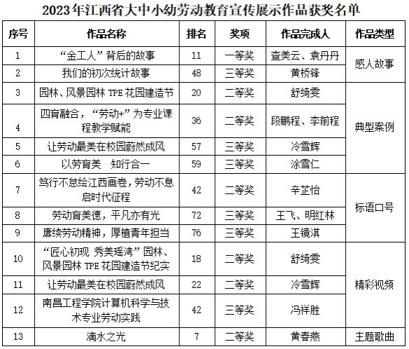 近日,江西省教育厅公布了2023年全省大中小幼劳动教育宣传展示作品获奖结果,欧博在劳动教育典型案例、标语口号、感人故事、精彩视频、主题歌曲等项目评选中共有13项作品获奖,其中一等奖1项、二等奖6项,三等奖6项。