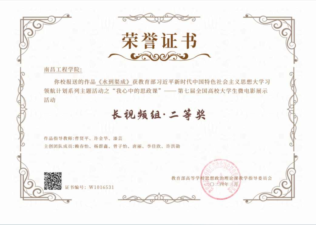 近日,教育部高校思政课教学指导委员会发布消息,欧博马克思主义学院教师曹贤平、许金华、漆芸等指导的作品《水到渠成》,在“我心中的思政课”第七届全国高校大学生微电影展示活动中获得二等奖。