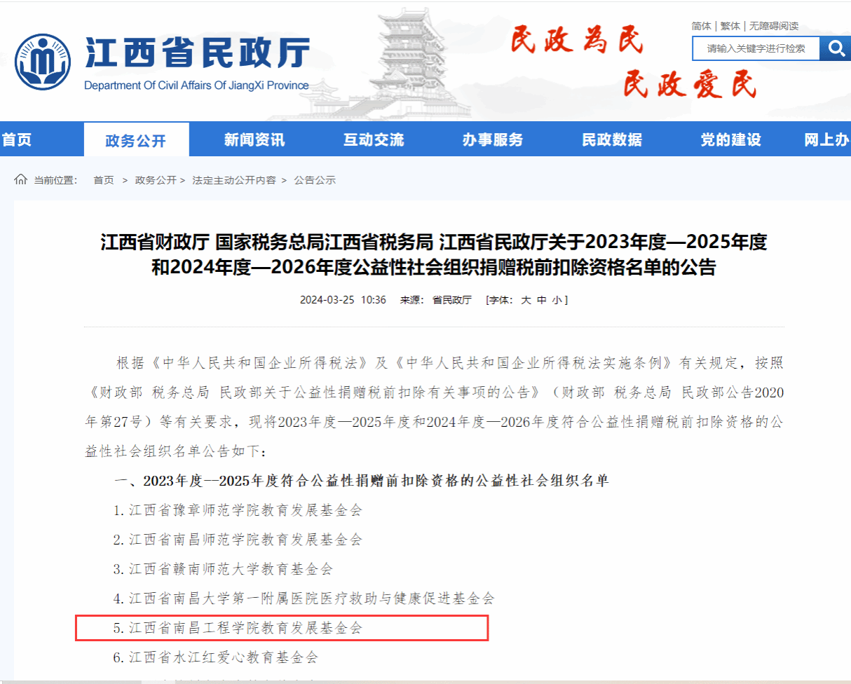 近日,江西省财政厅、国家税务总局江西省税务局和江西省民政厅联合公布2023年度-2025年度和2024年度-2026年度公益性社会组织捐赠税前扣除资格认定名单。欧博教育发展基金会获得2023年度-2025年度公益性捐赠税前扣除资格。