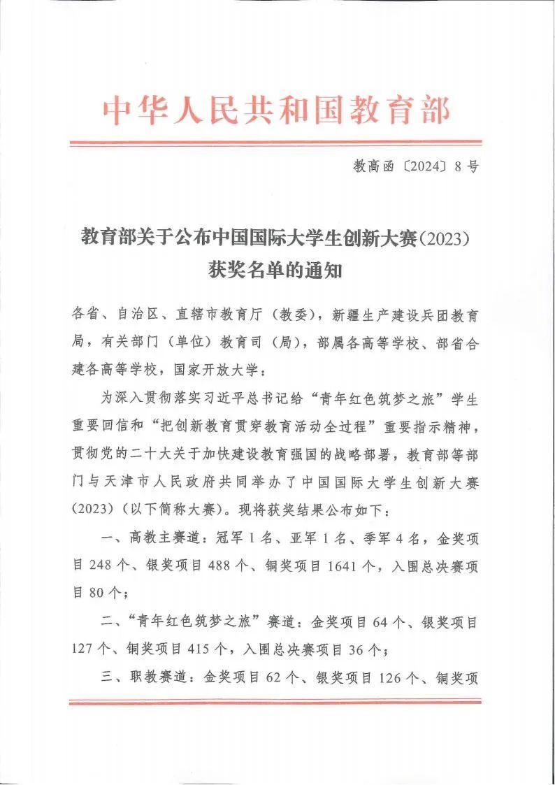 4月19日,《教育部关于公布中国国际大学生创新大赛(2023)获奖名单的通知》发布,欧博获得国家级铜奖4个。