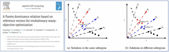 针对高维多目标优化问题的求解,王帅在《Applied Soft Computing》上发表题为“A Pareto dominance relation based on reference vectors for evolutionary many-objective optimization”的学术论文,提出了基于参考向量Pareto支配的高维多目标进化算法。基于一组均匀分布的参考向量,将种群中的解划分到若干个子区域。设计了基于目标函数值排名的收敛度量来确定两个解之间的支配关系,以增强算法的收敛性。通过控制不同子区域中解的密度,以保持种群多样性。仿真实验测试了76个基准问题,结果表明,提出的支配关系在处理高维多目标优化问题时具有良好的收敛性和多样性,优于其它8种知名的支配关系。