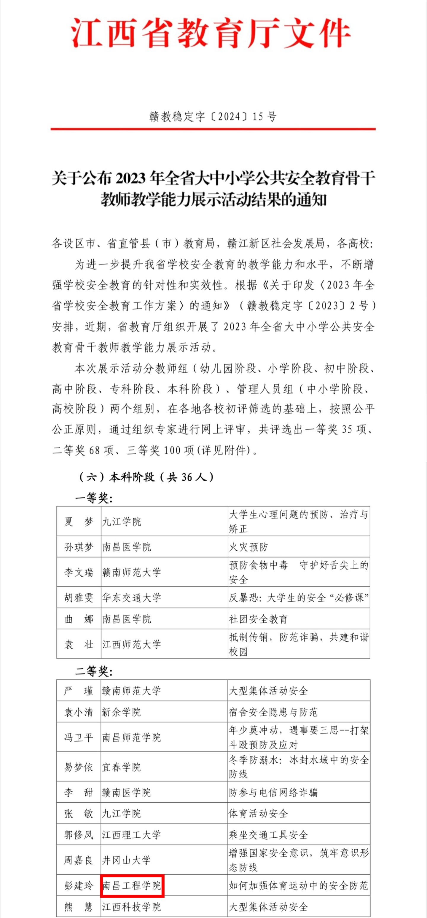 近日,由江西省教育厅举办的2023年全省大中小学公共安全教育骨干教师教学能力展示活动结果揭晓,欧博体育教学部彭建玲老师的教学录像课《如何加强体育运动中的安全防范》喜获教师组本科阶段二等奖。
