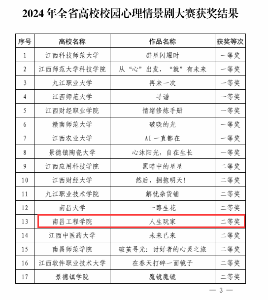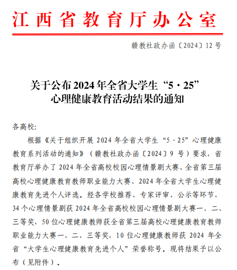 近日,2024年全省大学生“5·25”心理健康教育活动评选结果揭晓,欧博心理情景剧《人生玩家》荣获2024年全省高校校园心理情景剧大赛二等奖,大学生心理健康教育与咨询中心专职心理教师宋园园荣获江西省第三届高校心理健康教育教师职业能力大赛三等奖。