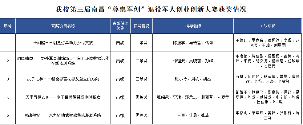 近日,欧博5个项目在南昌市退役军人事务局主办的第三届南昌“尊祟军创”退役军人创业创新大赛中荣获佳绩,其中“松间照—创意灯具”荣获一等奖、“洞影烛微” 荣获二等奖、“执子之手—智能导盲杖” 荣获三等奖、“天眼寻踪”和“畅灌智驱” 荣获优胜奖。