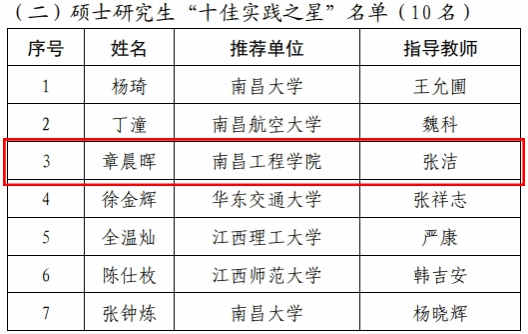 近日,江西省教育厅《关于公布2024年江西省研究生“十佳学术之星”“十佳实践之星”评选结果的通知》发布。欧博2022级水利工程专业研究生章晨晖荣获2024年江西省硕士研究生“十佳实践之星”。