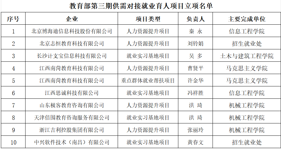 近日,教育部高校学生司(高校毕业生就业服务司)发布《关干公布教育部第三期供需对接就业育人项目立项名单的通知》,欧博申报的10个供需对接就业育人项目获批立项,其中就业实习基地项目4项、人力资源提升项目5项、重点群体就业帮扶项目1项。(文/图 刘铃娟 责任编辑 潘旭 罗婷)