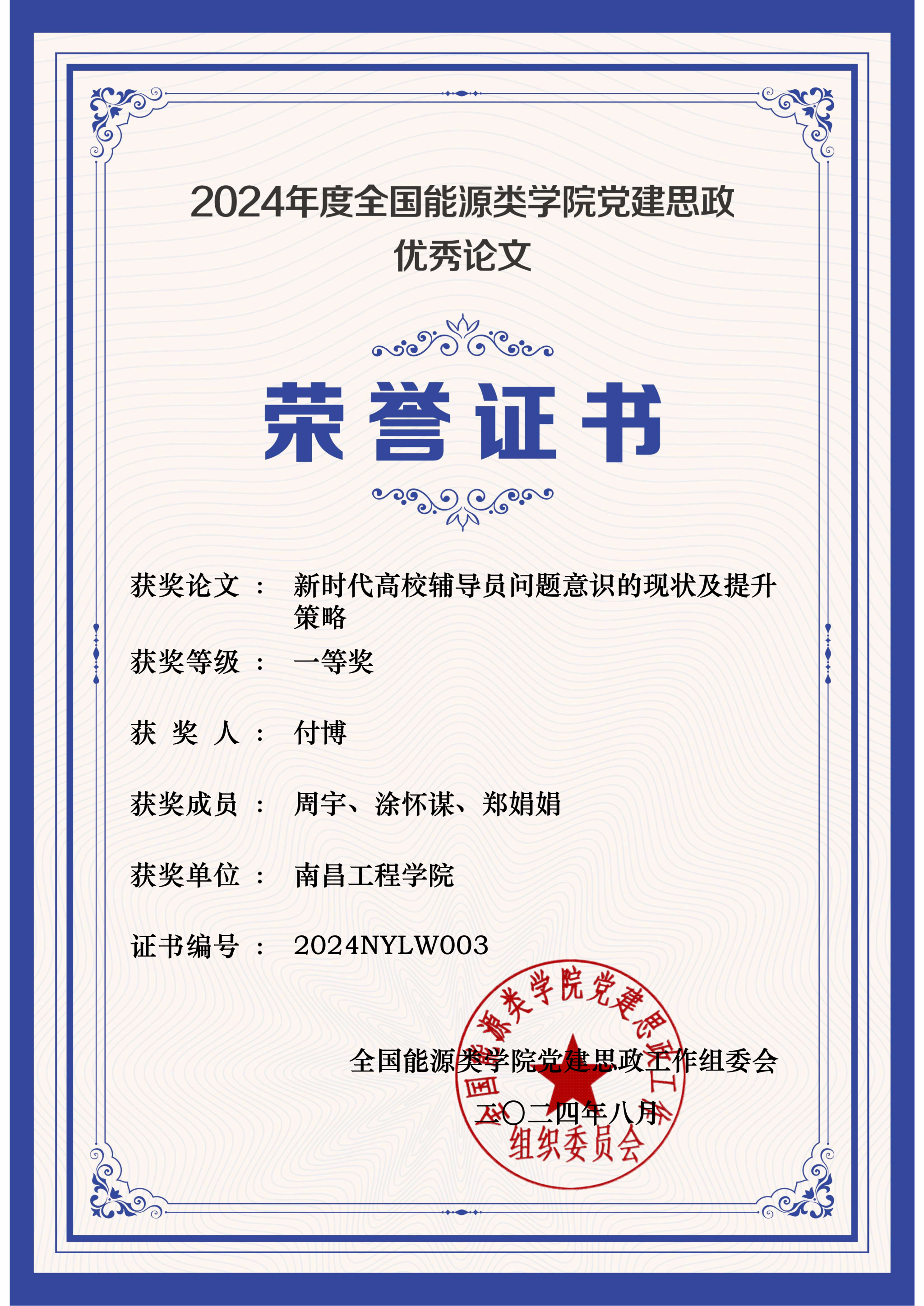 近日,2024年度全国能源类学院党建思政优秀论文评选结果揭晓,欧博电气工程学院付博团队申报的论文《新时代高校辅导员问题意识的现状及提升策略》荣获思政论文一等奖。
