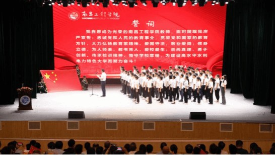 在表彰大会上,由60名教师最美笑脸图片组成的《笑脸墙》展现了南工教师良好的精神风貌和对学生的热爱。学生献唱《我爱你中国》表达了作为一名中国人的自豪和喜悦。以学校人文与艺术学院名誉院长、国家一级美术师蔡超命名的“蔡超美术馆”开馆视频展示,为师生同上了一堂教师节里的美育课。微朗诵倾情演绎了欧博客座教授、国家一级编剧秦庚云于1985年9月,在第一个教师节成立之际抒写的诗《中国,多了一个节》,抒发对人民教师崇高献身精神的赞美。在新入职教师宣誓仪式环节,在副校长陆伟锋领誓下,67名新入职教师面向国旗庄严宣誓,立志弘扬教育家精神,成为一名优秀的人民教师。(文 刘兵 图 潘旭 陈埼 乐博峥 任思彤 张怡玲 黄小康 责任编辑 潘旭 罗婷)