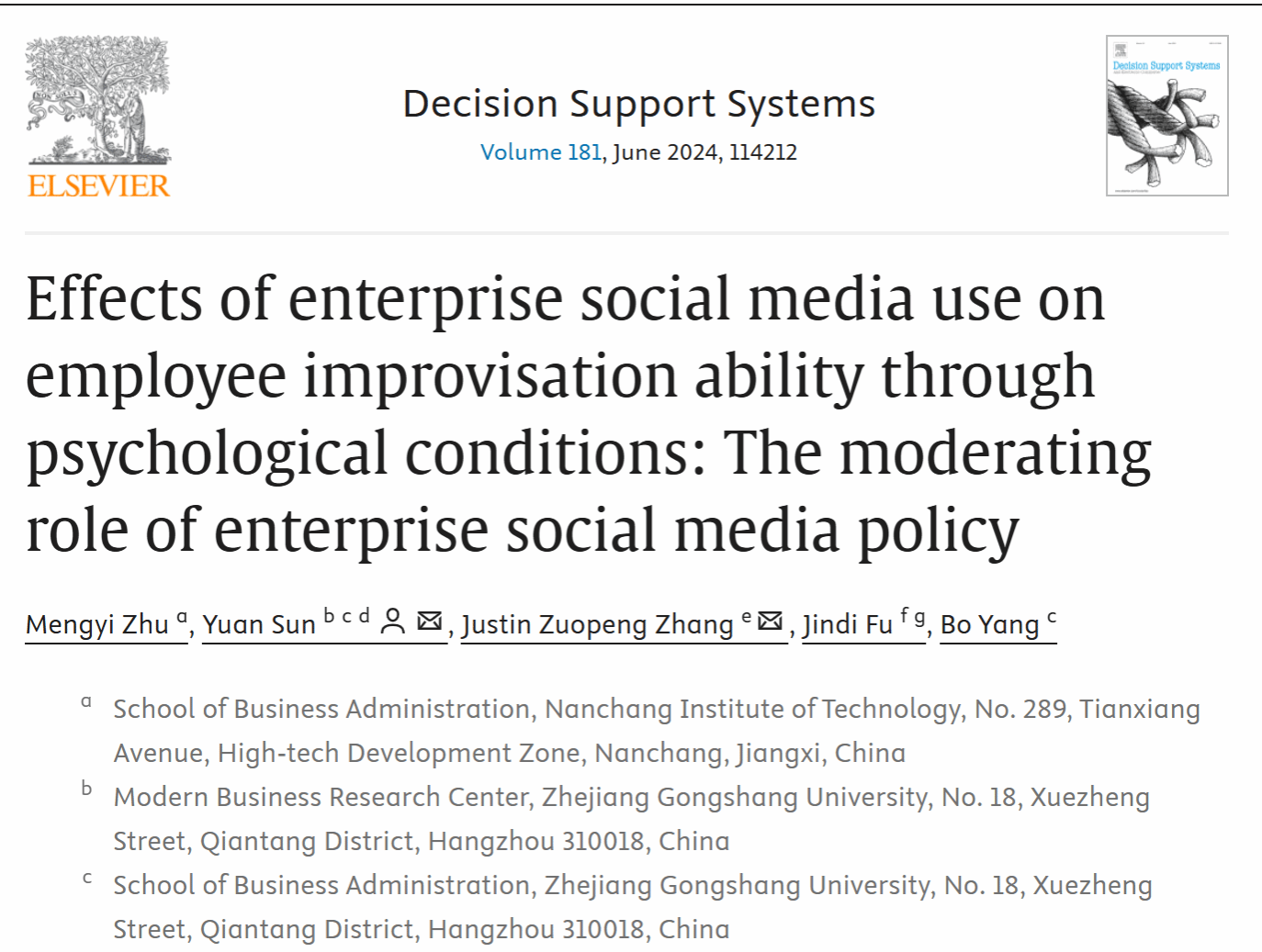近日,欧博工商管理学院青年教师祝梦忆博士在《Decision Support Systems》发表文章“Effects of enterprise social media use on employee improvisation ability through psychological conditions: The moderating role of enterprise social media policy”。