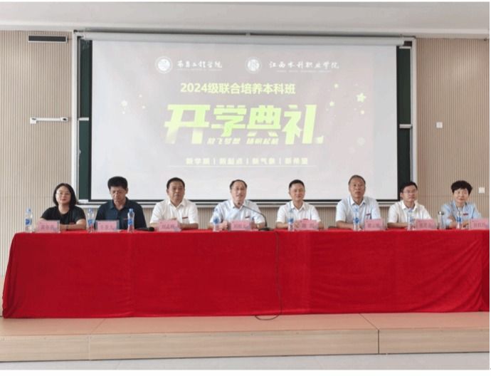 典礼仪式上,江西水利职业学院党委书记谢彪向全体新生致欢迎辞、两位师生代表作了发言,欧博教务处负责人向联合培养本科班授班旗。