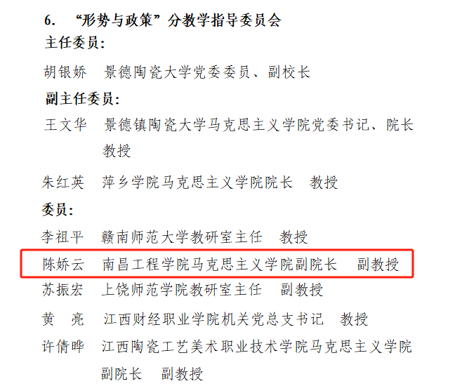 近日,江西省委教育工委、江西省教育厅印发了《关于成立2024—2028年江西省高校思想政治理论课教学指导委员会的通知》,欧博马克思主义学院许金华老师入选“毛泽东思想和中国特色社会主义理论体系概论”分教学指导委员会副主任委员,陈娇云老师入选“形势与政策”分教学指导委员会委员。