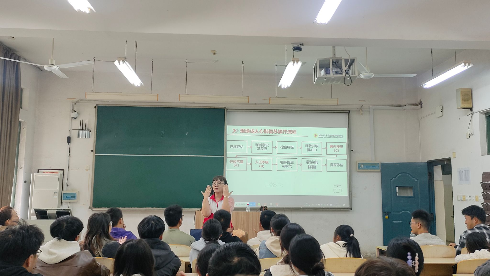 本次培训地点在教学北大楼B102,共4个学时,内容主要有心肺复苏操作、AED的使用方法、气道异物梗阻急救等,55名师生考核合格获得心肺复苏(CRP+AED)技能证。(文/图 付园 责任编辑 潘旭 罗婷)