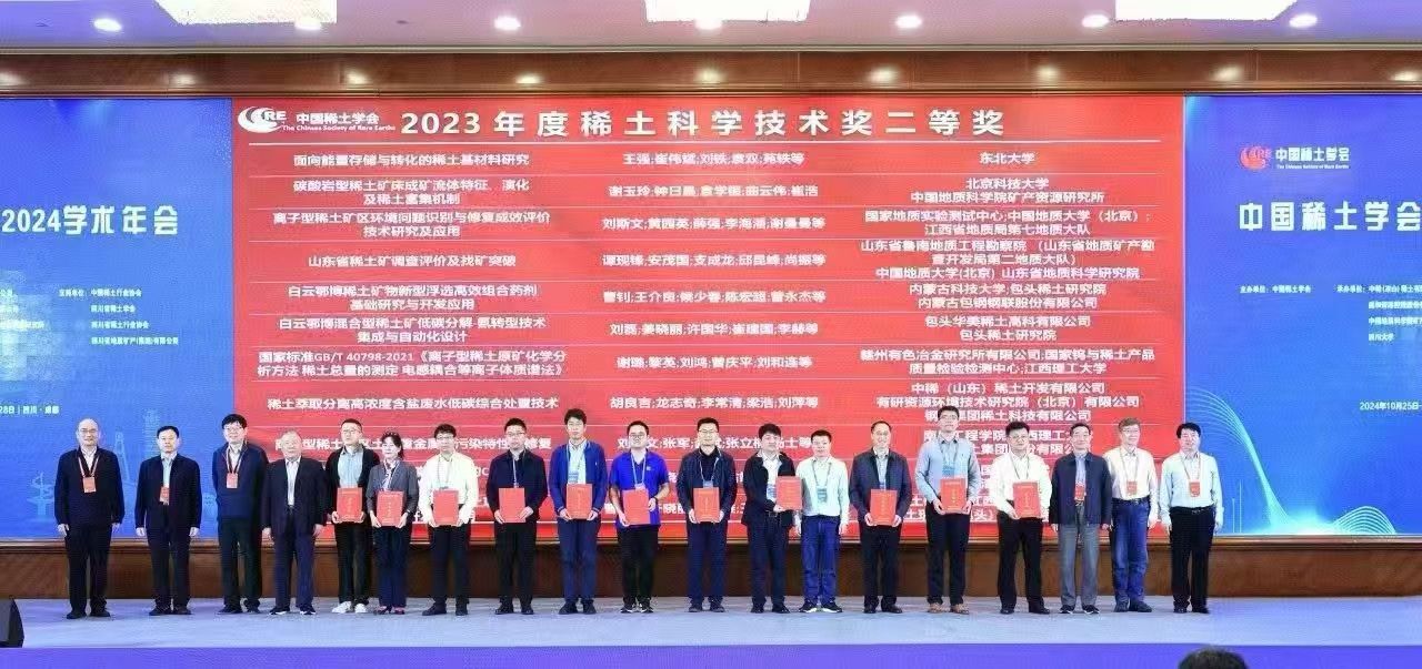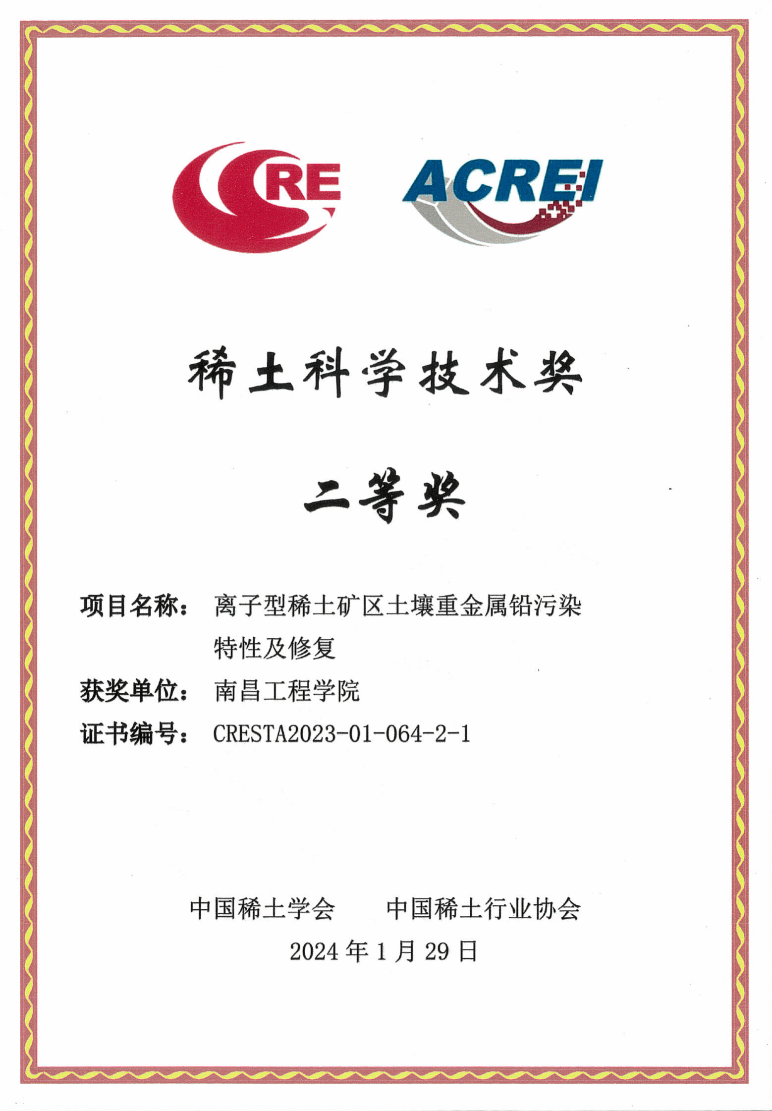 10月26日—27日,由中国稀土学会主办的“中国稀土学会2024学术年会”在四川省成都市举办。会上宣读了《关于2023年度稀土科学技术奖获奖项目的决定》,欧博刘祖文教授团队研究成果《离子型稀土矿区土壤重金属铅污染特性及修复》荣获稀土科学技术奖二等奖。该成果由欧博与江西理工大学、虔东稀土集团股份有限公司等单位合作完成,揭示了离子型稀土矿区伴生典型重金属释放析出、迁移转化和修复技术理论,为有效控制重金属在离子型稀土土壤中的化学行为、稀土矿区土壤生态安全和环境可持续发展和植被复垦奠定了理论基础。