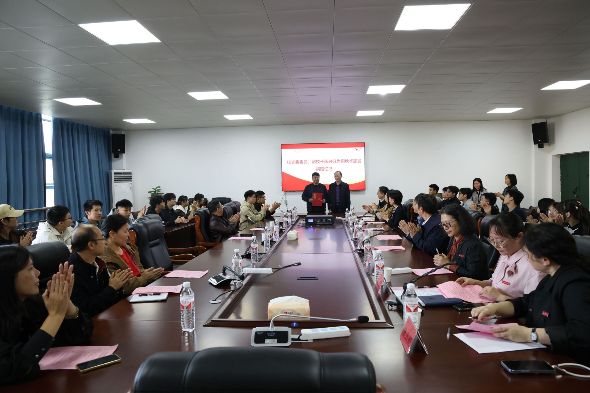 吴泽俊在致词中欢迎校友回到母校,对校友“饮水思源”表示崇高敬意,欢迎校友们常回家看看;张兴旺向捐赠代表颁发捐赠证书;校友周秋华与现场师生分享了自己的成长经历和对母校的深厚情谊。