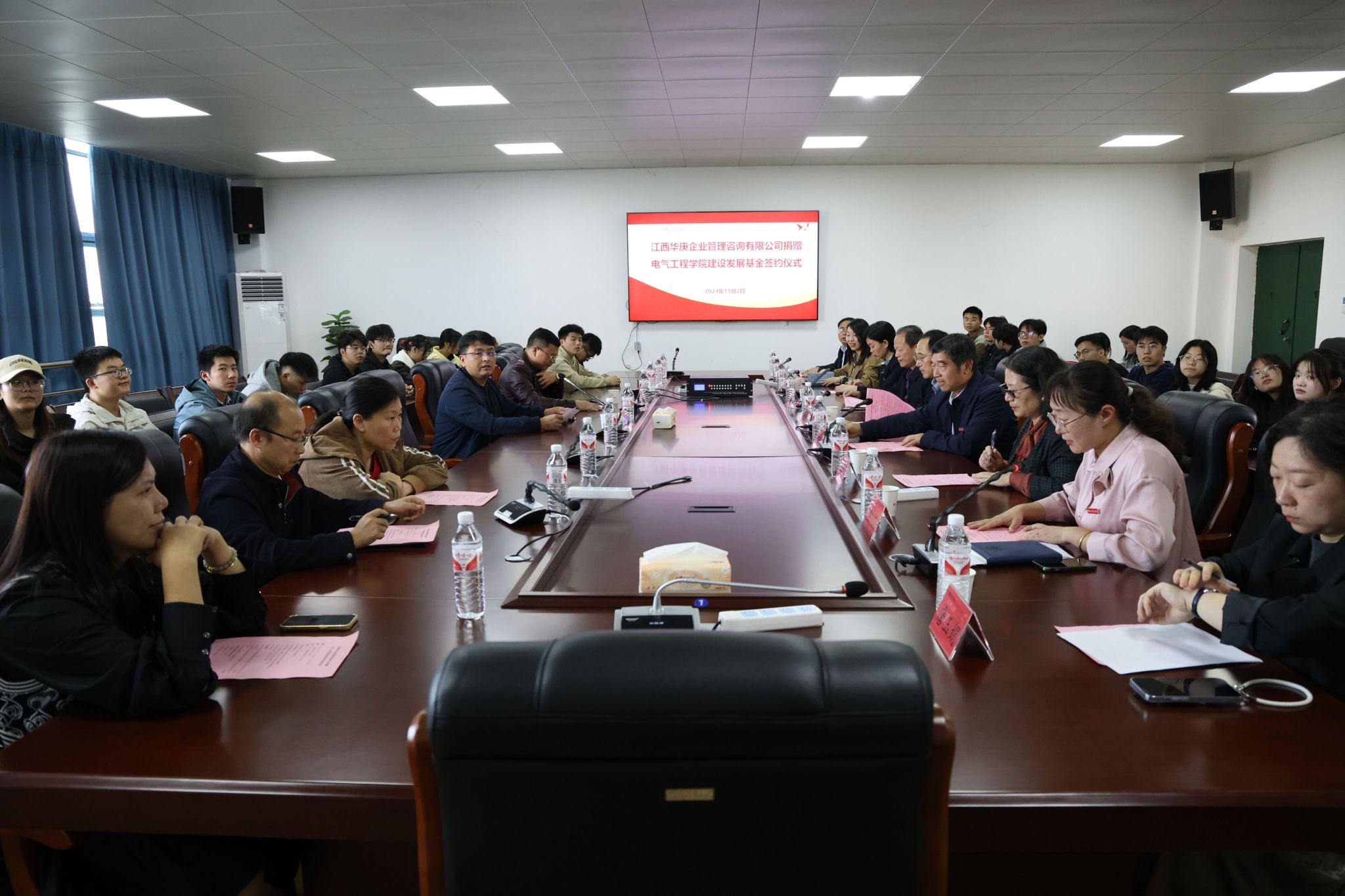 11月2日,电气工程学院建设发展基金捐赠仪式在机械电气楼B303会议室举行。校长刘祖文、校党委副书记吴泽俊、副校长张兴旺,建设发展基金捐赠者、江西华庚企业管理咨询有限公司总经理、1999级供用电技术专业校友周秋华,2002级工程造价专业校友李凌卿出席仪式,校友(基金)会办公室、校工会、电气工程学院相关负责人和师生代表参加活动。