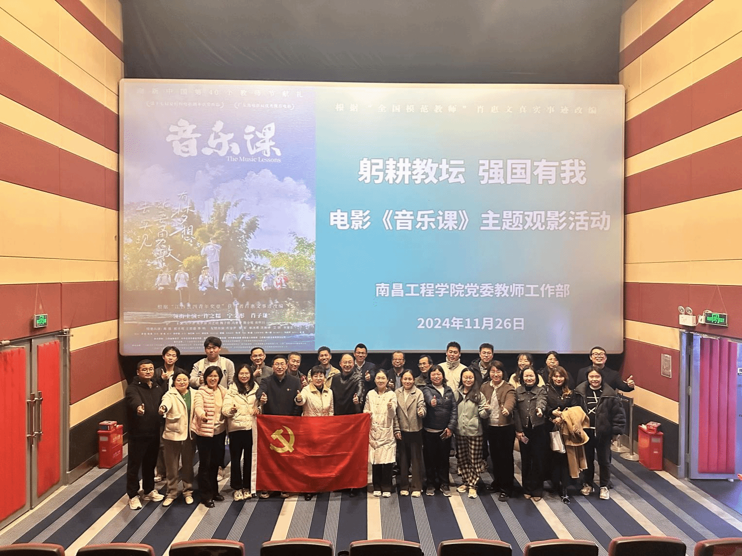 11月26日,党委宣传部、党委教师工作部组织100名教职工在潇湘青春影城开展“躬耕教坛,强国有我——《音乐课》主题观影”活动,大力弘扬和践行教育家精神,进一步推动学校师德师风建设。