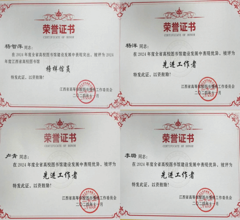 近日,江西省高等学校图书情报工作委员会对2024年度全省高校图书馆工作者进行了表彰。