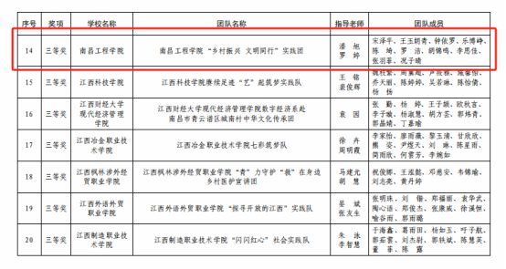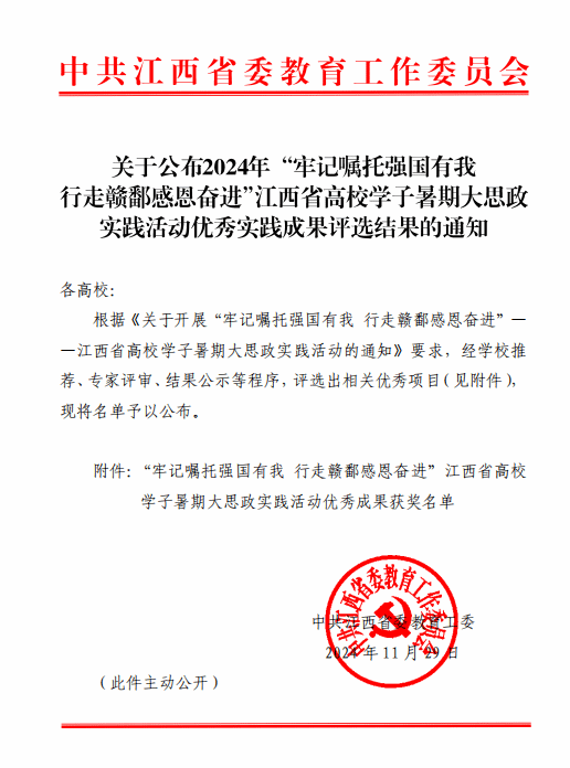 近日,省委教育工委发布《关于公布2024年“牢记嘱托强国有我 行走赣鄱感恩奋进”江西省高校学子暑期大思政实践活动优秀实践成果评选结果的通知》,由欧博融媒体中心潘旭老师、罗婷老师指导的“乡村振兴 文明同行”实践团被评为优秀实践团队三等奖。