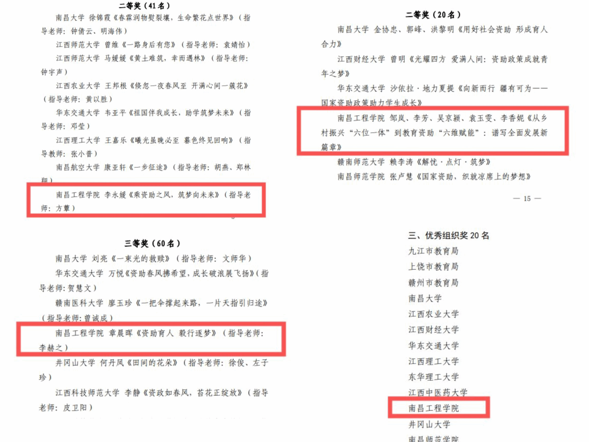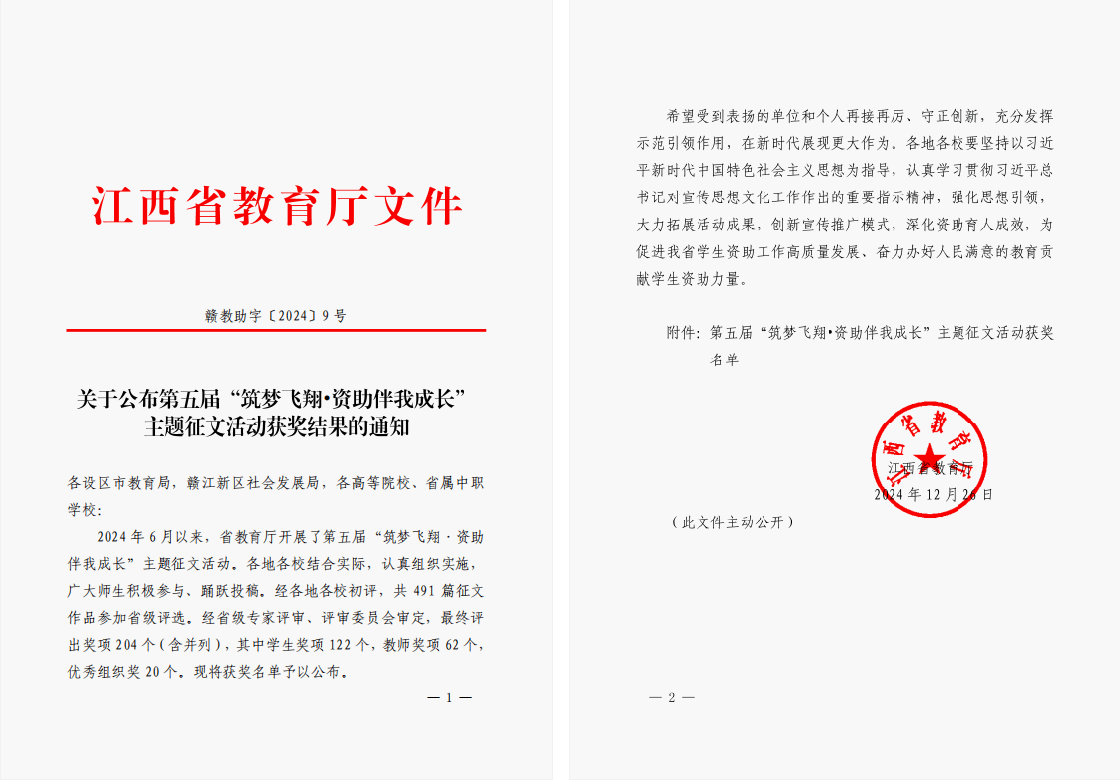 近日,江西省教育厅公布了第五届“筑梦飞翔·资助伴我成长”主题征文活动获奖结果。欧博获得学生奖项2项,资助工作者奖项1项,南昌工程学院获评优秀组织奖。其中,2023级水文与水资源工程专业李永媛《乘资助之风,筑梦向未来》获学生奖项二等奖,2022级水利工程专业研究生章晨晖《资助育人 毅行逐梦》获学生奖项三等奖;资助工作者奖项《从乡村振兴“六位一体”到教育资助“六维赋能”:谱写全面发展新篇章》获二等奖。