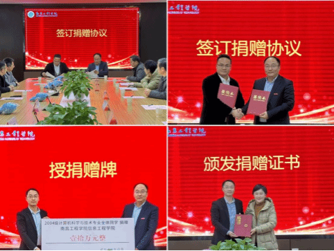 仪式上,信息工程学院负责人与校友代表签订捐赠协议,并接受捐赠牌,向校友代表颁发捐赠证书。(文/王文莉 刘皓 图/刘浩威 责任编辑 潘旭 徐金兰)