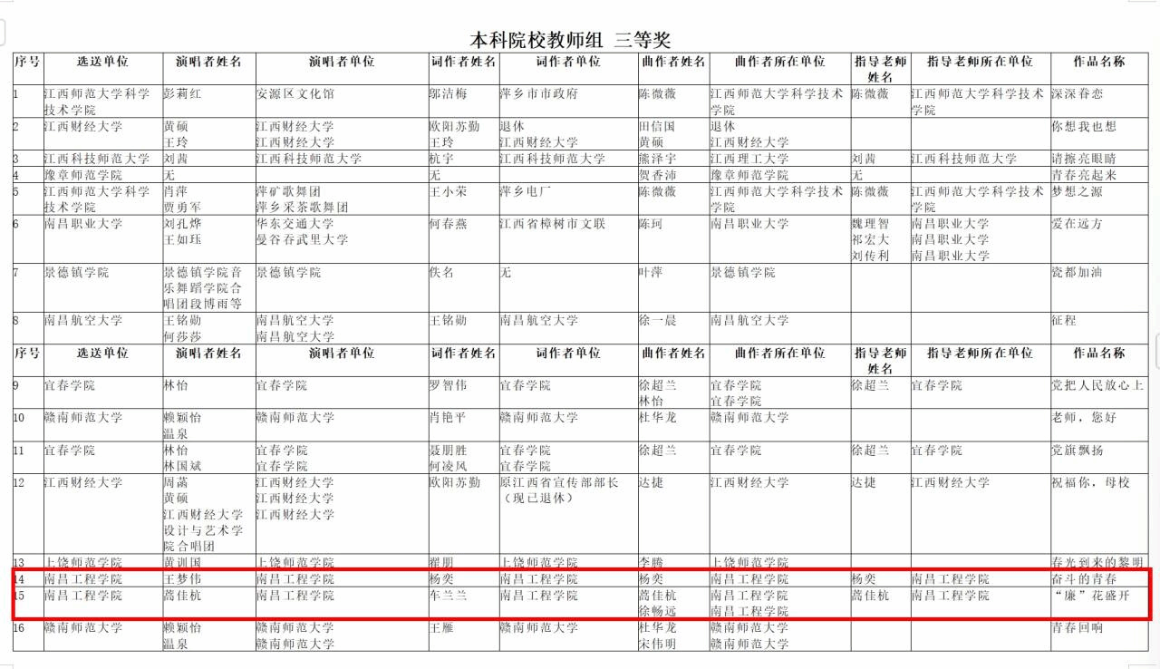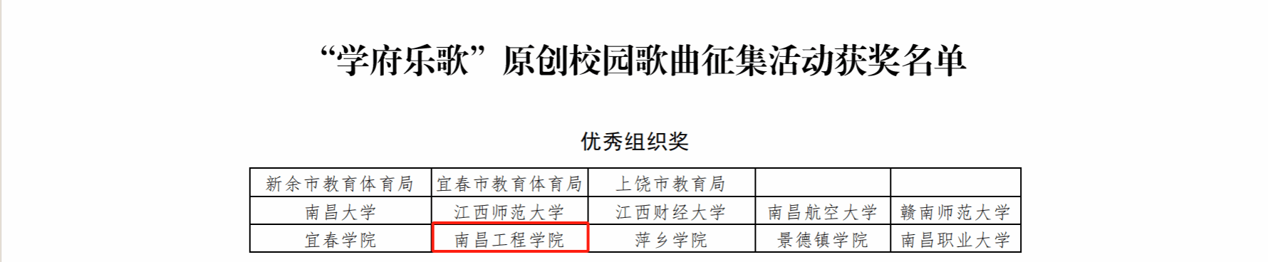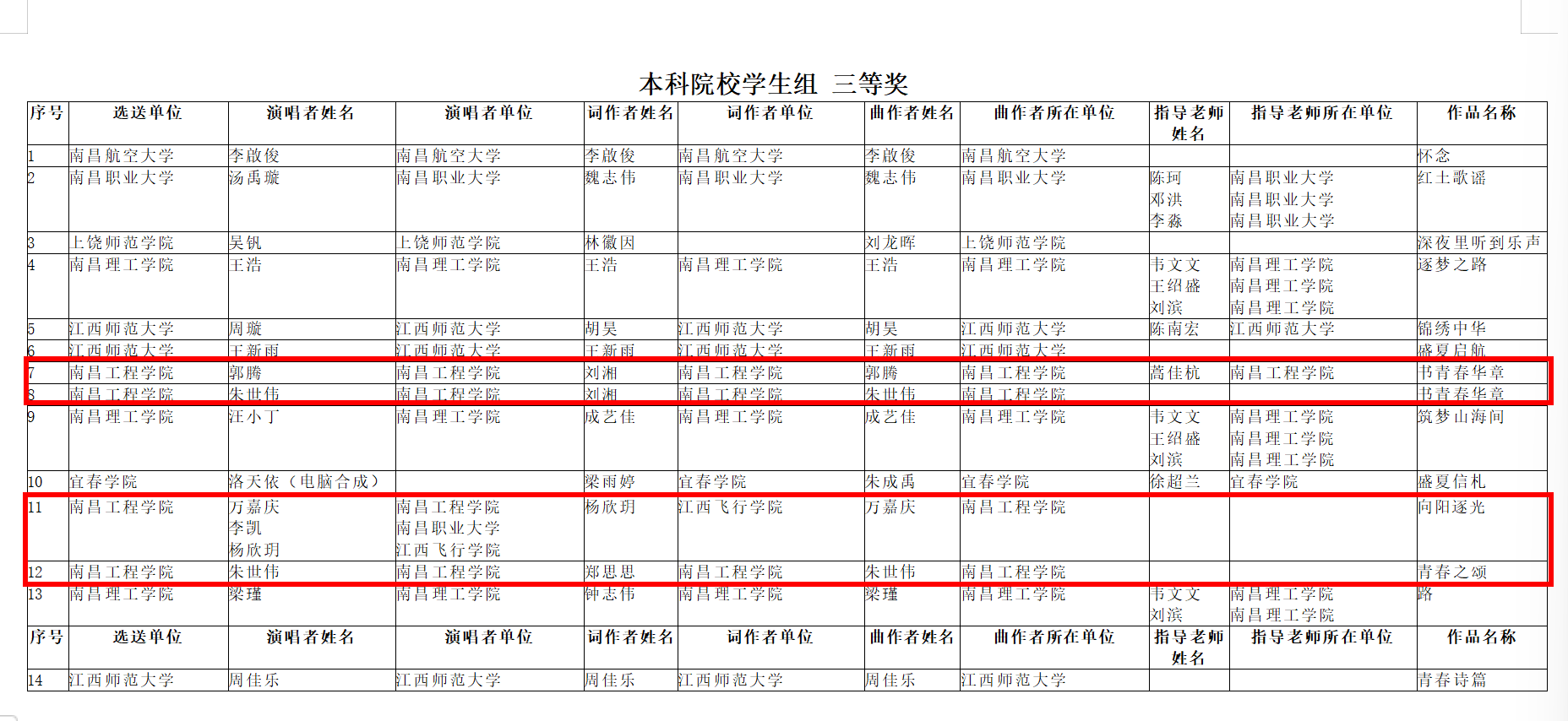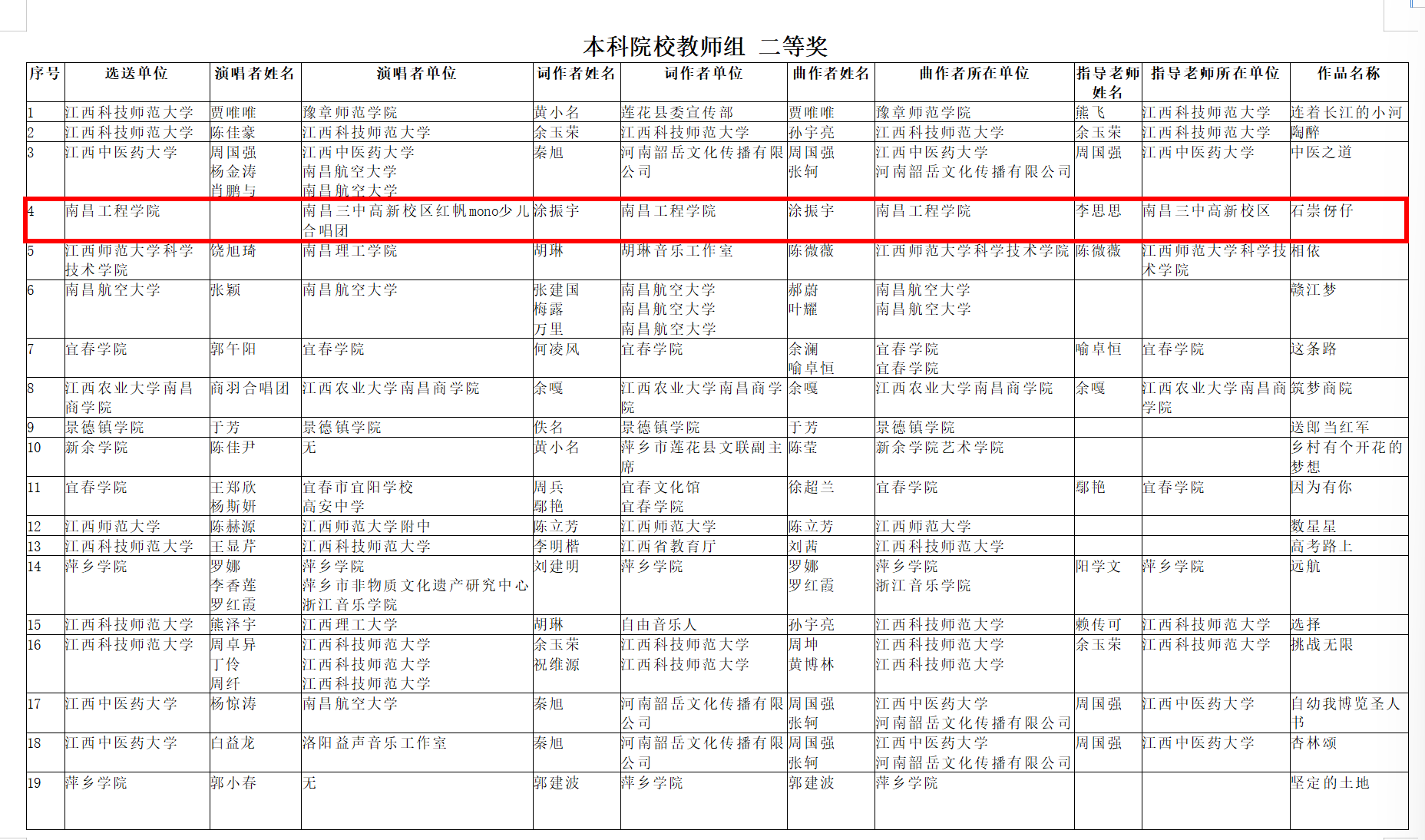 近日,省教育厅公布了“学府乐歌”原创校园歌曲征集活动拟获奖名单。欧博荣获“优秀组织奖”,并分别在本科院校教师组、本科院校学生组中取得了好成绩。信息工程学院涂振宇老师作词作曲的《石崇牙仔》荣获本科院校教师组二等奖,人文与艺术学院杨奕老师作词作曲的《奋斗的青春》和蒿佳杭老师作曲演唱、车兰兰老师作词的《“廉”花盛开》分别荣获本科院校教师组三等奖。2022级编辑出版专业刘薇、2022级网络与新媒体专业舒心绿团队作品《红色信仰》荣获本科院校学生组二等奖,2020级音乐学专业郭腾、朱世伟团队作品《书青春华章》和《青春之颂》、2023级音乐学专业万嘉庆团队作品《向阳逐光》荣获本科院校学生组三等奖。