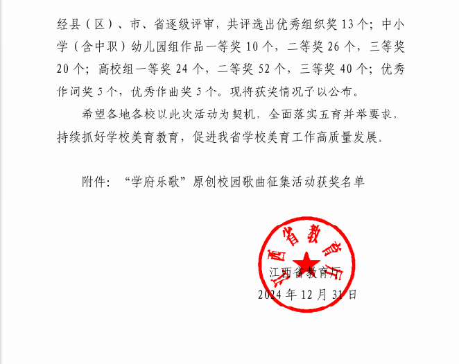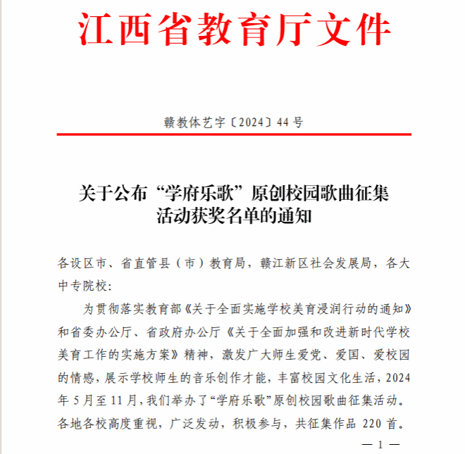 据悉,由江西省教育厅主办的首届原创校园歌曲征集活动旨在激发广大师生爱党、爱国、爱校园的情感,展示学校师生的音乐创作才能,丰富校园艺术文化。欧博将继续秉持“以美育人,以文化人”的教学理念,不断加强艺术教育,厚植爱国情怀,培养更多德智体美劳全面发展的人才。(文/图 丁蓓蒂 刘薇 责任编辑 潘旭 胡洁)
