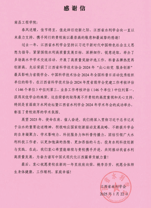 近日,江西省水利学会向欧博致感谢信,对欧博长期以来的鼎力支持和携手同行表达诚挚谢意,对双方未来的合作充满期待。