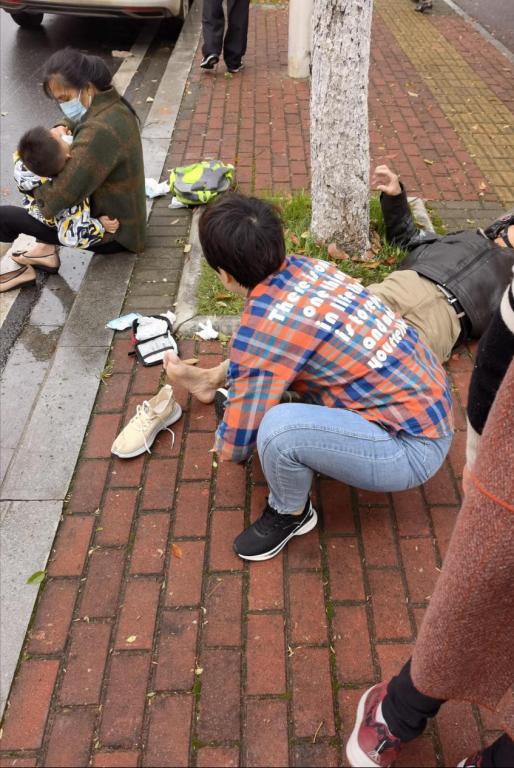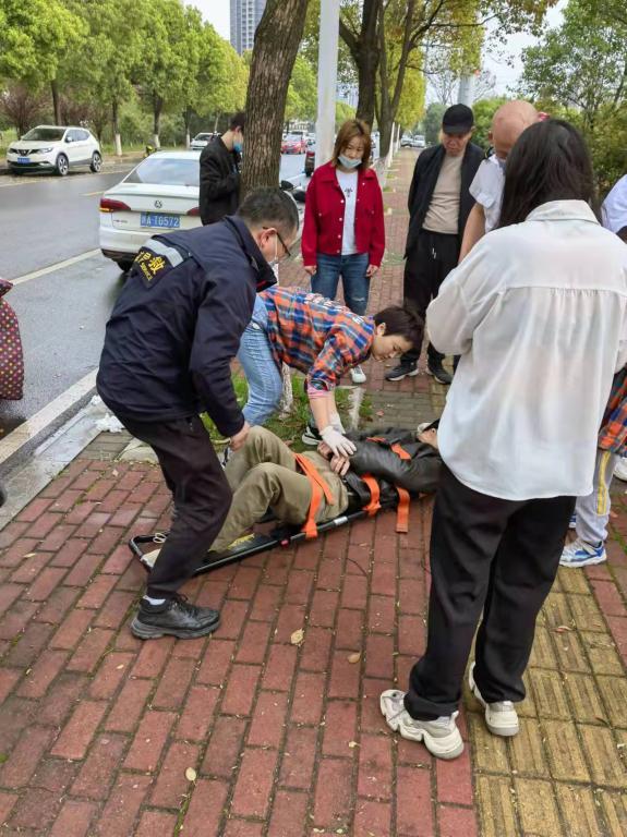 当天早晨,代珊像往常一样乘坐丈夫的车前往学校上班,刚出小区门,就遇到一起车祸事故——小轿车撞飞电动车,一名伤者倒地不醒,两名伤者受伤。职业的敏感让代珊没有一丝犹豫,她赶紧让丈夫就近停车,带着急救包下车跑到伤员旁边。确认轿车司机已打120后,代珊开始查看伤者的肤色、脉搏,以及是否心脏骤停。当时其中一位伤者已经躺在地上失去意识,代珊呼叫伤者没有得到回答,迅速查看该伤者的颈总动脉,确定还有脉搏无生命危险后,代珊悬着的心放下些许。紧接着,代珊转身查看小孩和另一位成年伤者的情况。当时小孩头部有擦伤,成年伤者左小腿外伤流血不止。代珊为其包扎好伤口后,让一旁的丈夫捡回了他们散落在四处的物品,帮小孩把掉落的鞋子穿好,耐心安抚一直在哭泣的小孩。当时伤者家属赶到现场后,想将倒地的伤者扶起来,代珊立马开口劝告:“不能扶!万一伤到腰椎,导致腰椎错位,扶起来反而可能有瘫痪的风险。”为了确保三位伤者的安全,代珊为他们包扎好伤口后也没有离去,而是等待救护车来,配合急救中心人员把伤员转移才离开现场。