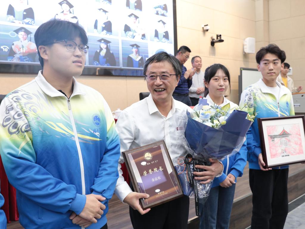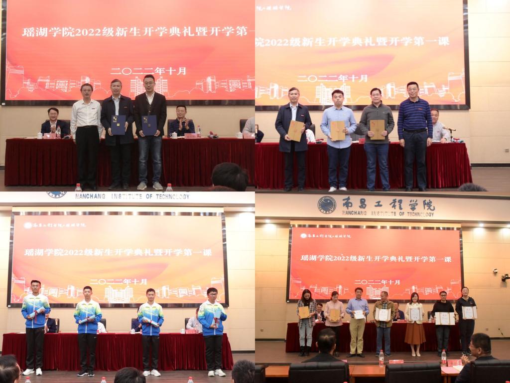 校领导和老师们为瑶湖学院责任教授、2022级学业导师、首批荣誉教师颁发聘书,为新生代表佩戴瑶湖学院院徽。