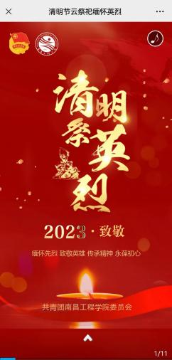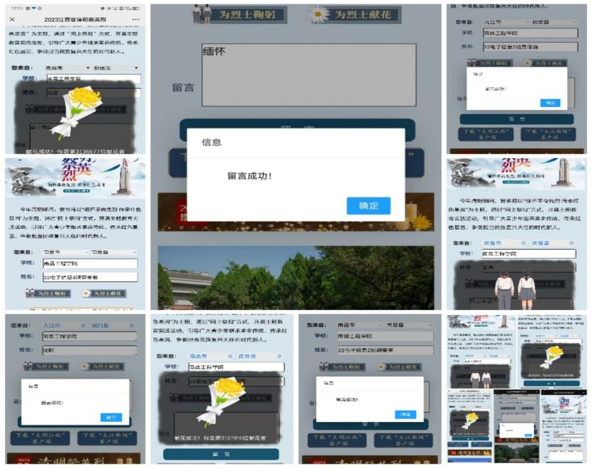 校团委制作了“清明祭英烈”主题H5,引导广大团员青年在线上向烈士鞠躬并献花,通过南昌工程学院水宝宝微信视频号进行“悼念英烈”网络直播诵读活动。各学院班级团支部还通过江西文明网开展了“2023·奋进·网上祭英烈”活动,通过网络平台祭拜、献花、留言的方式寄托对革命先烈先辈的哀悼。(文/胡洁 钟雪茹 图/各学院团委 责任编辑 潘旭 徐金兰)