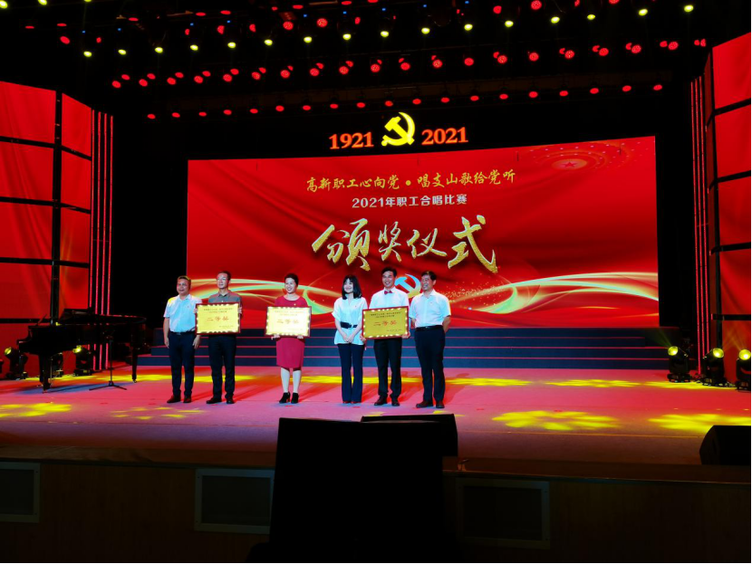 6月26日下午,南昌高新区“高新职工心向党 唱支山歌给党听”2021年职工合唱比赛在欧博瑶湖艺术中心举行,欧博教职工合唱曲目《迎风飘扬的旗》荣获二等奖。校党委书记、校长金志农,党委副书记吴泽俊,纪委书记殷安全作为嘉宾莅临比赛现场。