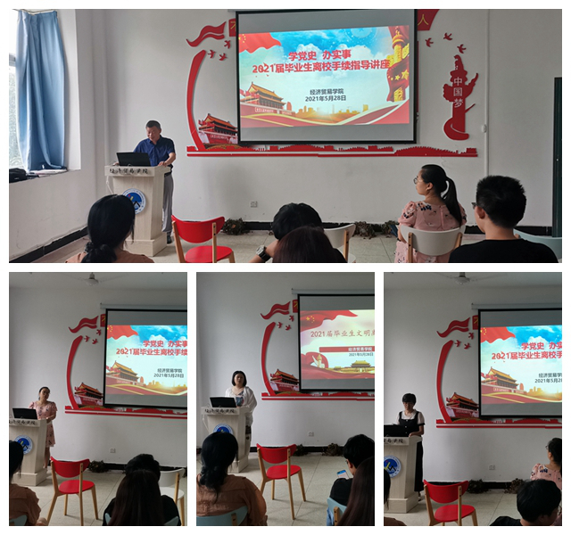 5月28日,经济贸易学院在新时代文明实践中心举办“学党史 办实事”2021届毕业生离校手续培训讲座,学院学生工作负责人、辅导员以及毕业班学生干部参加培训会。